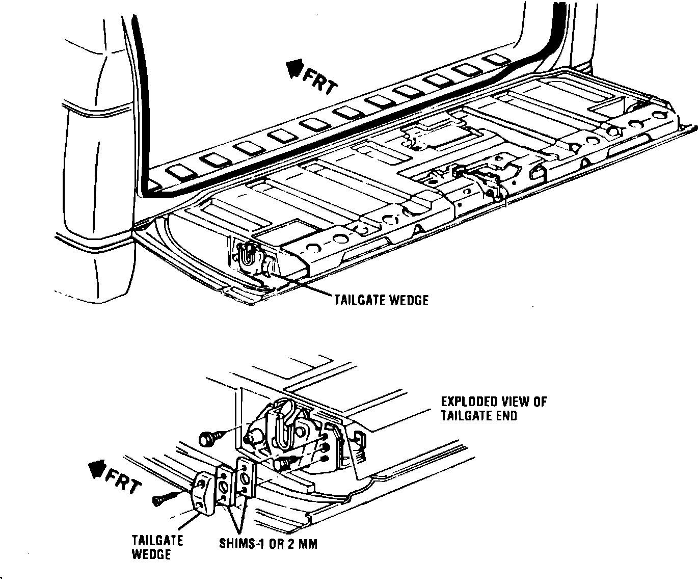 With the tailgate closed and the tailgate window lowered, look down the vertical side of the tailgate on both ends. What you should see is the tailgate wedges, shown in Figure 5, displacing the spring loaded body mounted wedges shown in Figure 3. If one or both of the body mounted wedges are not displaced, shim the tailgate mounted wedge(s) with 1 mm or 2 mm shims (P/N 15659205 1 mm, P/N 20093974 2 mm). If both spring loaded wedges are displaced then do nothing to this area.