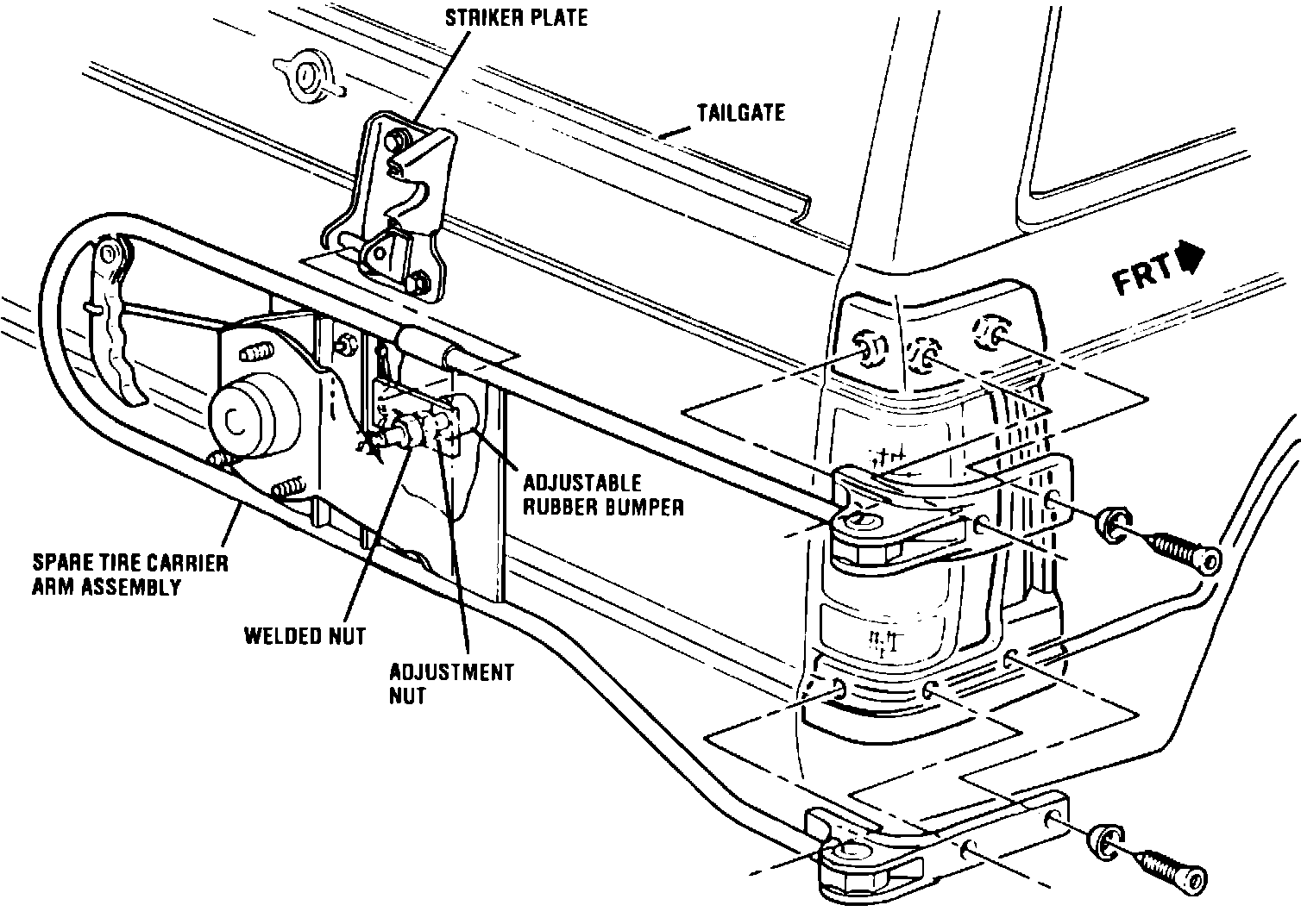 2) If the striker, shown in Figure 1, was not replaced during service procedure 1 then do so now. This is done because the adjustment outlined below will push the spare tire carrier arm away from the smaller rubber bumper on the old style striker plate. The resultant gap will continue to allow a rattle condition.