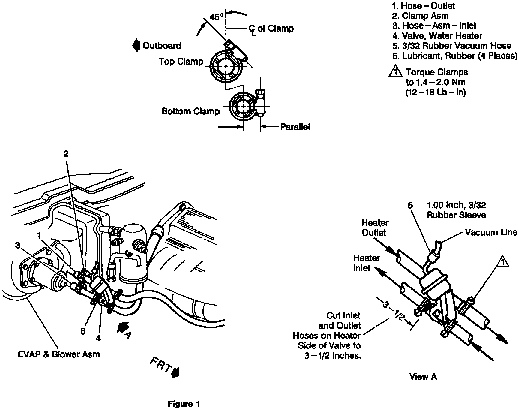 3. Insert the heater water valve, P/N 14044414, (Figure 1, Item 4) in the hoses and install the hose clamps, P/N 12337891, (Figure 1, Item 2). Torque the clamps to 1.4 - 2.0 N-m (12 - 18 lb.in.).