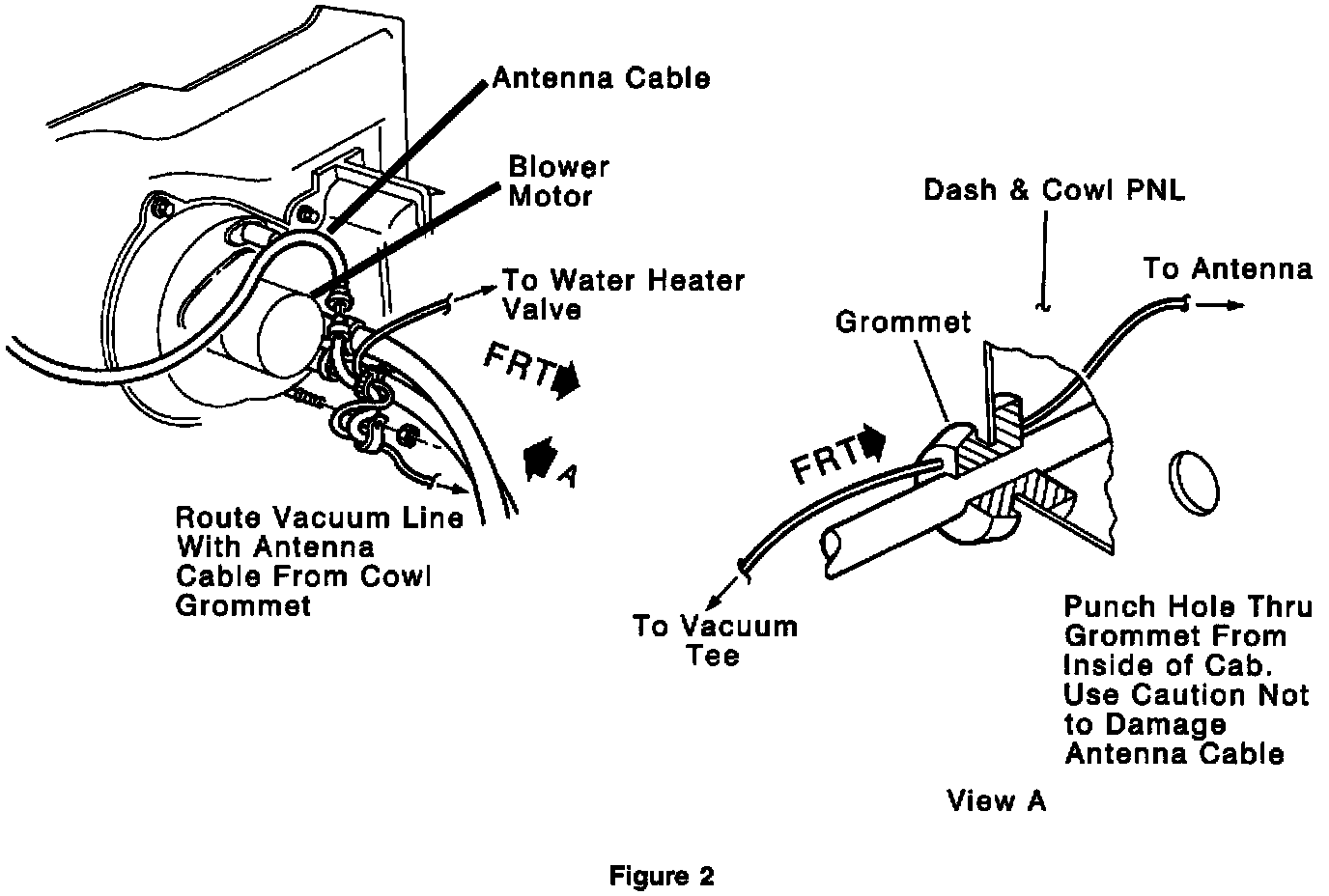 4. Install plastic vacuum line on the water valve fitting and add a 2.4 mm (3/32 in.) rubber sleeve for coupling (Figure 1). Route vacuum line with the antenna cable to the grommet into the dash area (Figure 2).