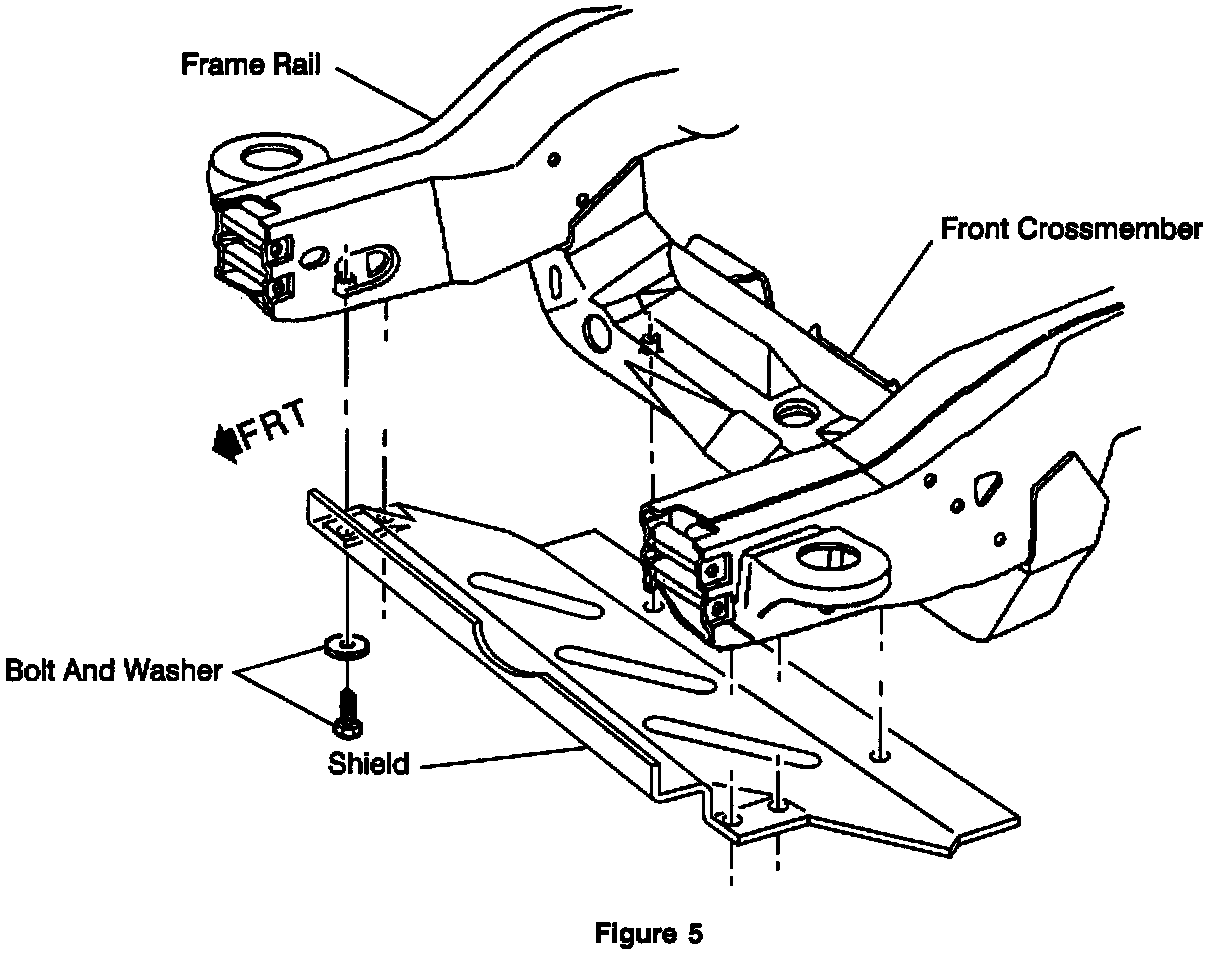 2. Place the shield, P/N 15564769, so that the back edge rests on the front cross member and the front outer edges rest on the frame rails (Figure 5).