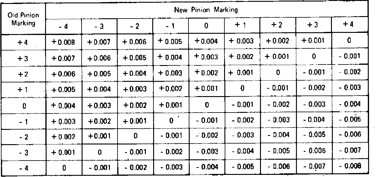 On the button end of the pinion there is a ``+'', `` - '', or ``0'' number which indicates the best running position for each particular gear set. This position is controlled by shims installed behind the inner bearing cup. If baffles or oil slingers are used, they are considered part of the adjusting shim pack.