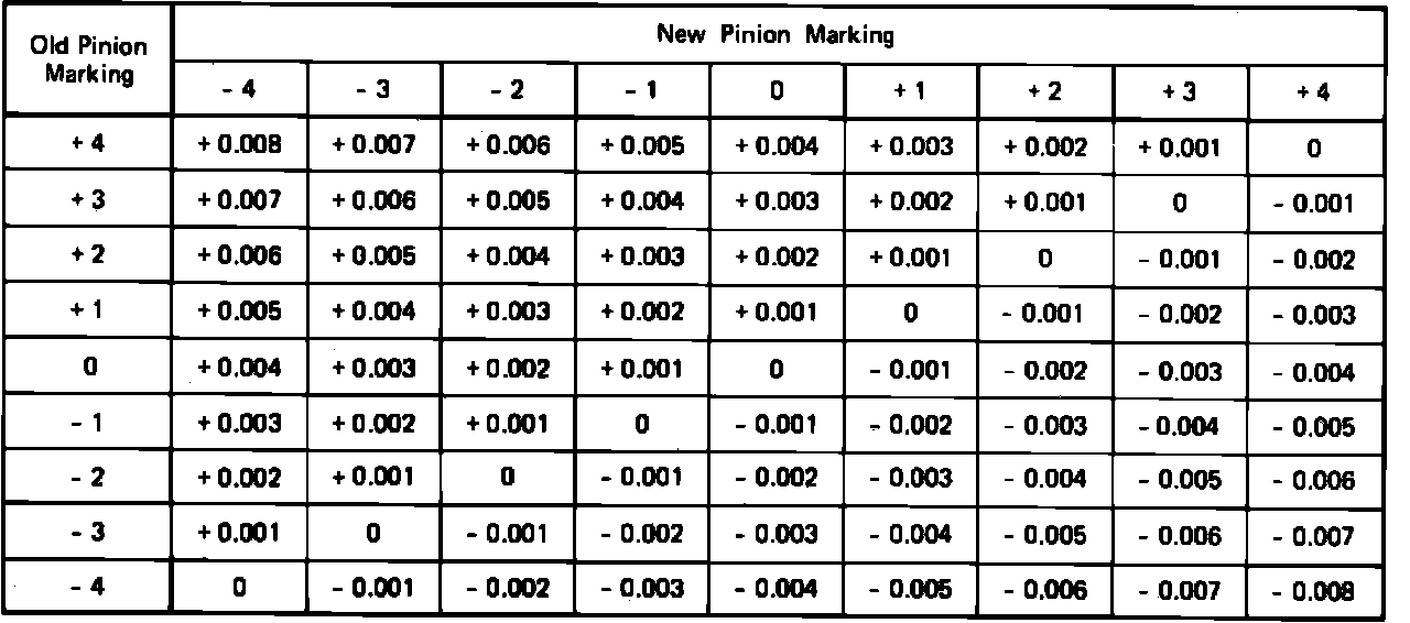 On the button end of the pinion there is a +, - , or 0 number which indicates the best running position for each particular gear set. This position is controlled by shims installed behind the inner bearing cup. If baffles or oil slingers are used, they are considered part of the adjusting shim pack.