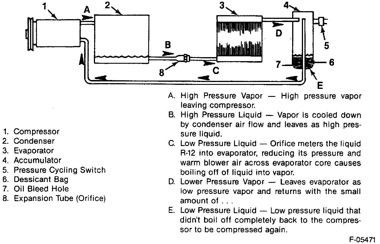 The high-pressure liquid then passes through the orifice tube, which changes it to a low-pressure, low-temperature liquid. This liquid then enters the evaporator.