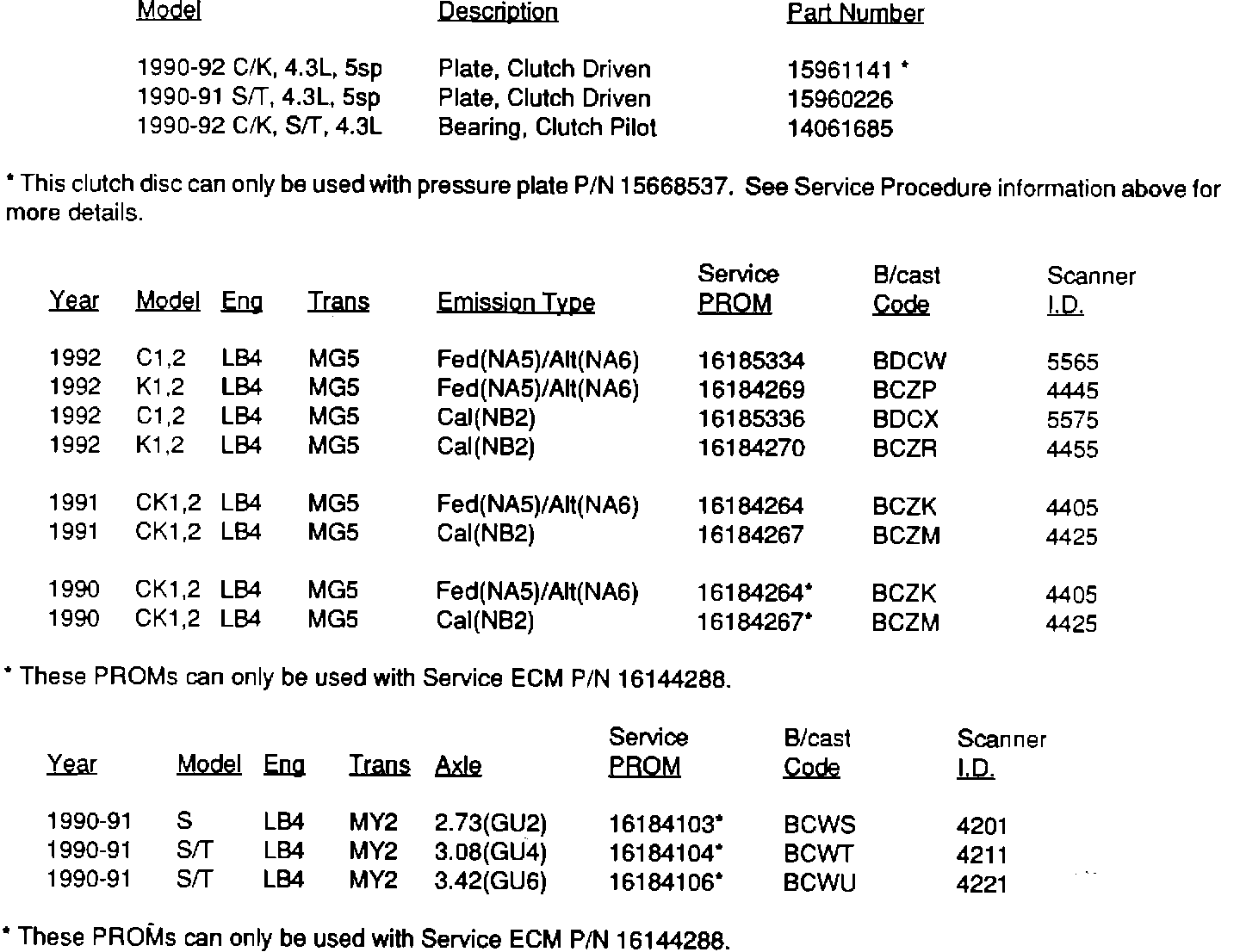 C/K trucks require pressure plate P/N 15668537 which was first used in production mid-1991. 1990 and 1991 vehicles built prior to the following VIN breakpoints require installation of P/N 15668537 unless it has already been installed in a service repair:
