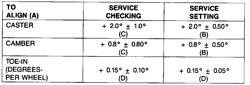 (D) Toe-in-left and right side to be set separately per wheel and steering wheel must be held in straight ahead position within ± 5.0 degree.