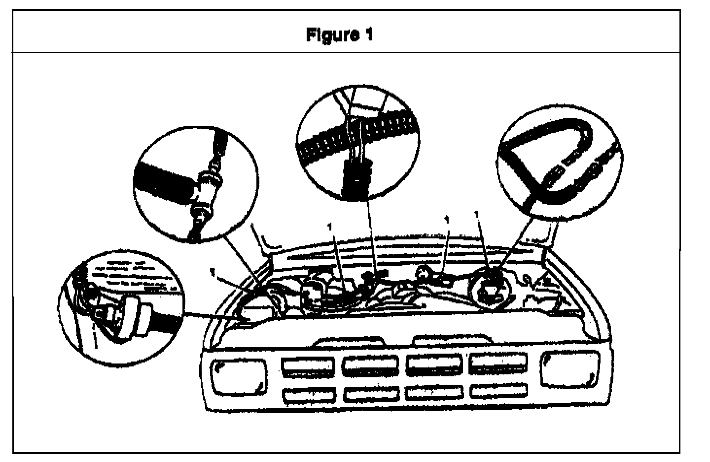 9. Route the new harness is shown in Figure 1 and secure it to the existing Underhood components at the locations indicated (1) using the tie straps provided in the kit.