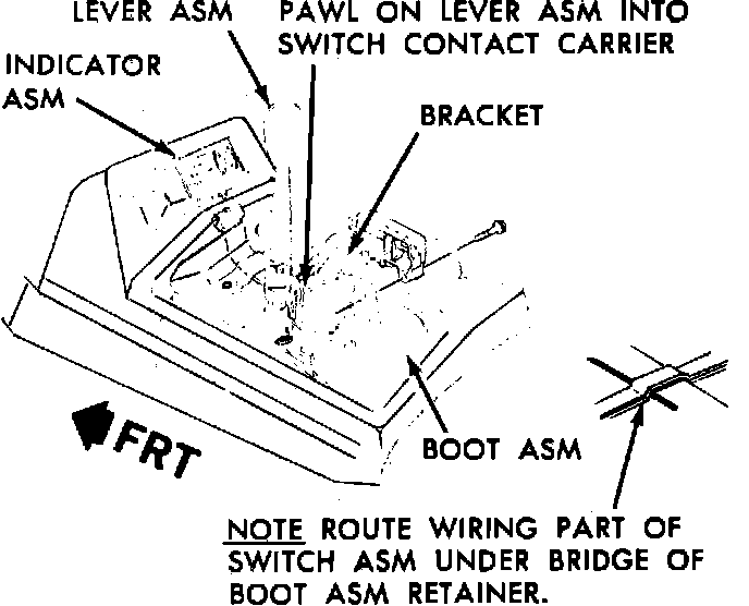 5. Position new switch on mounting bracket and install attaching screw.Ensure shift lever assembly pawl is on the switch contact carrier.