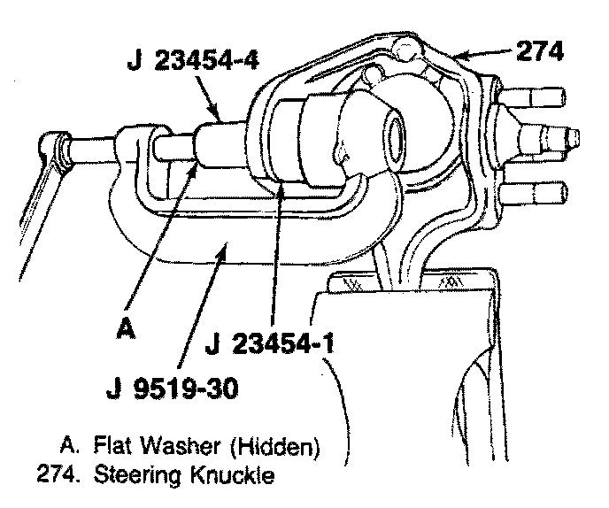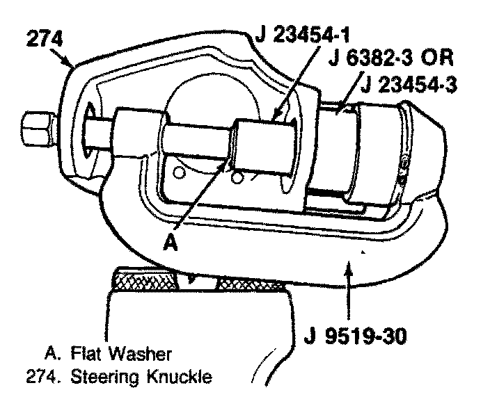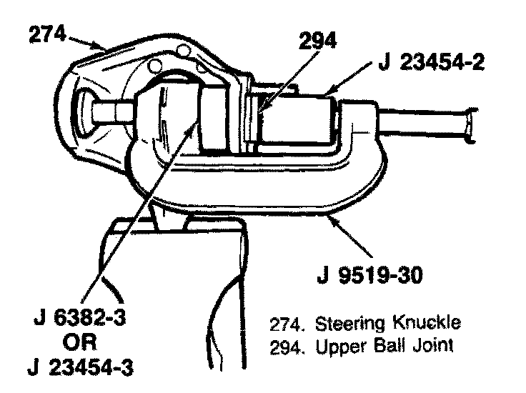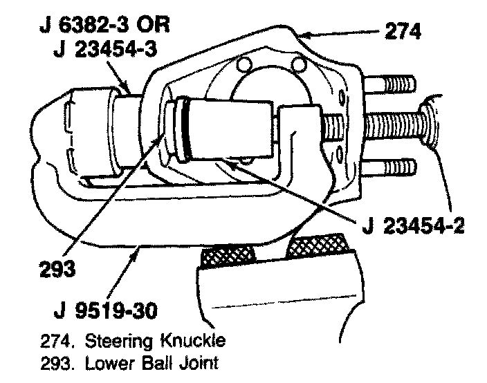 - Use J 9519-30, J 23454-3 (or J6382-3) and J 23454-4. Tighten until the ball joint breaks free of the steering knuckle.