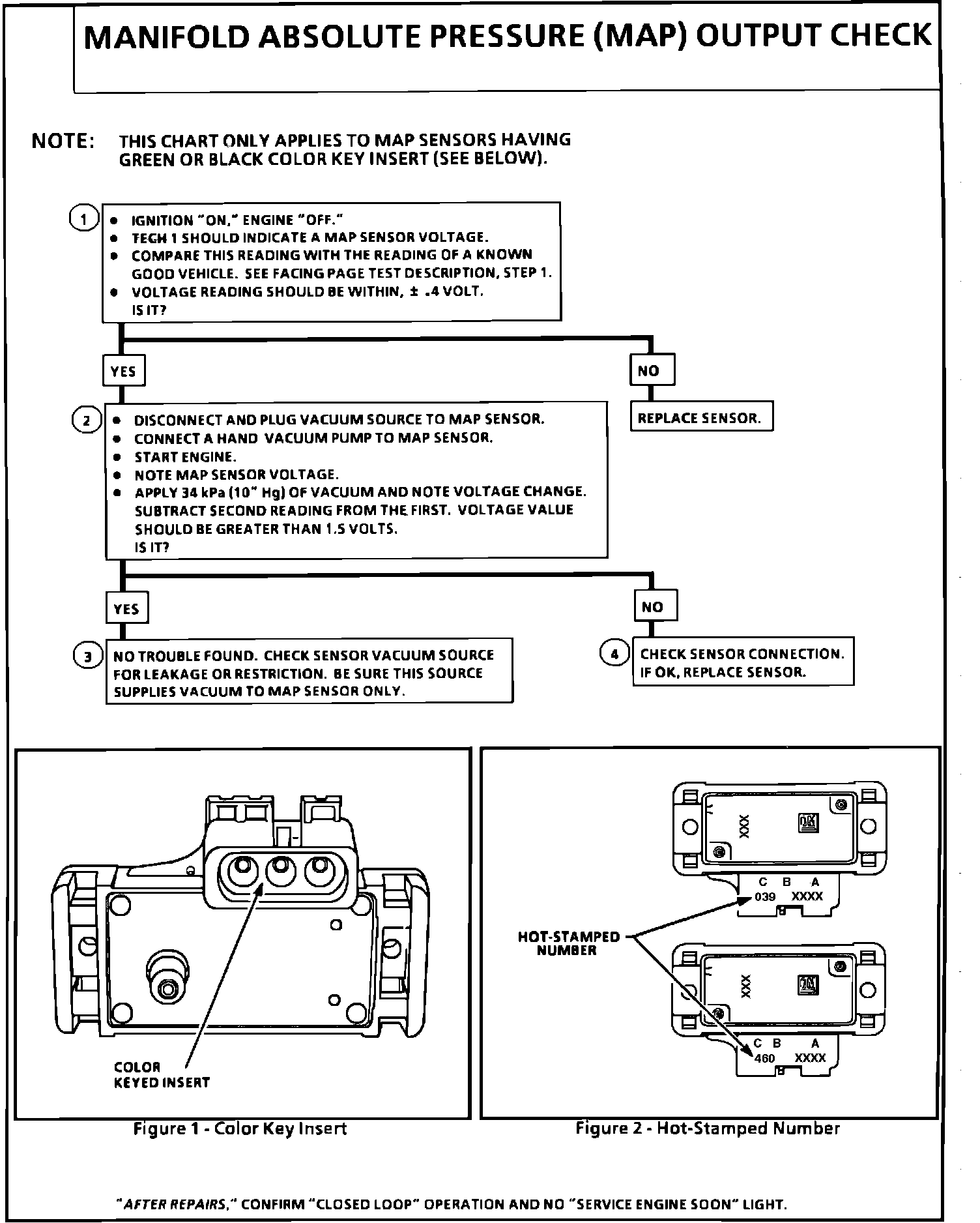 1. Checks MAP sensor output voltage to the PCM. This voltage, without engine running, represents a barometer reading to the PCM.
