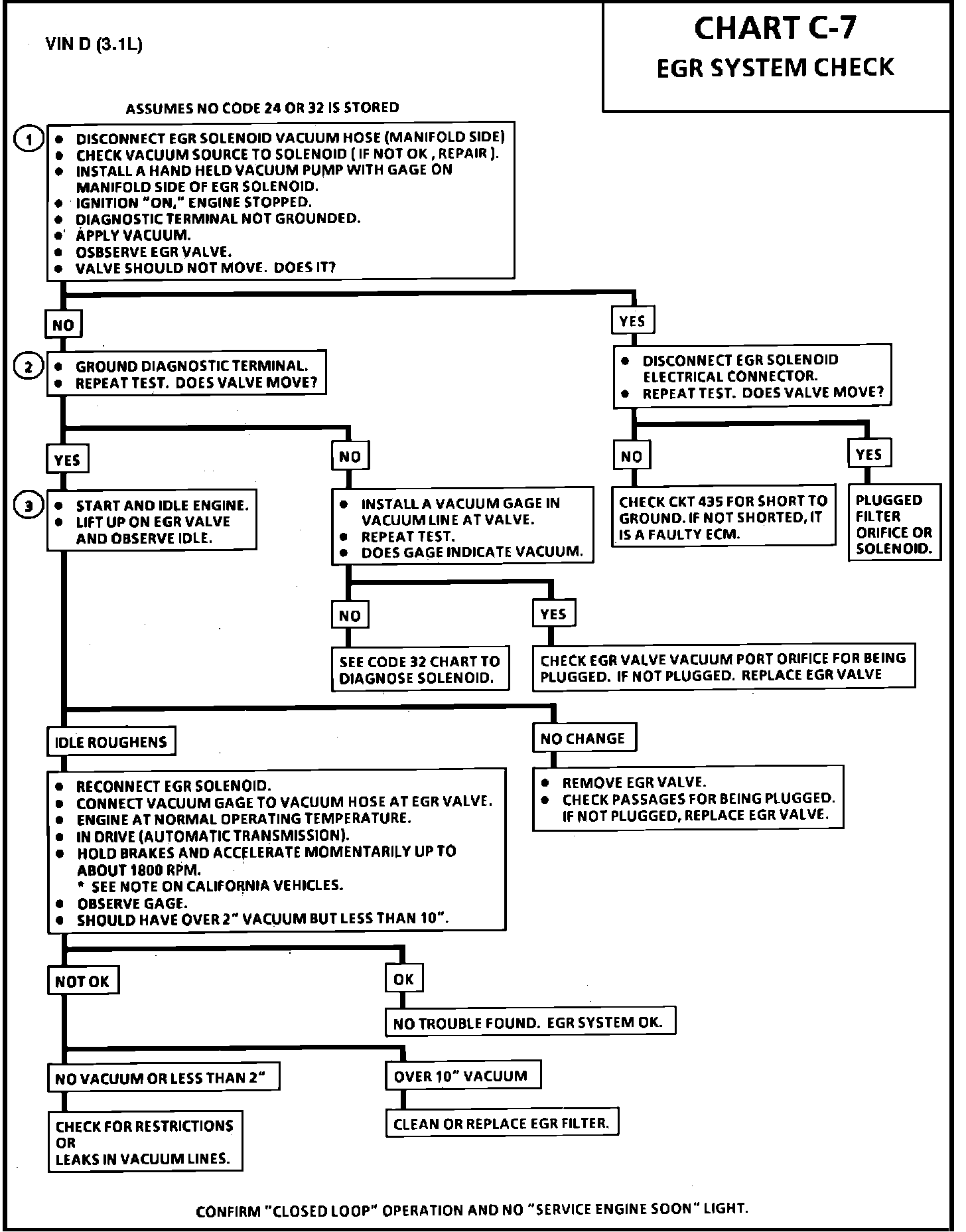 Code 32 will detect a faulty solenoid, vacuum supply, EGR valve or plugged passage. This chart checks for plugged EGR passages, a sticking EGR valve, or a stuck open or inoperative solenoid.