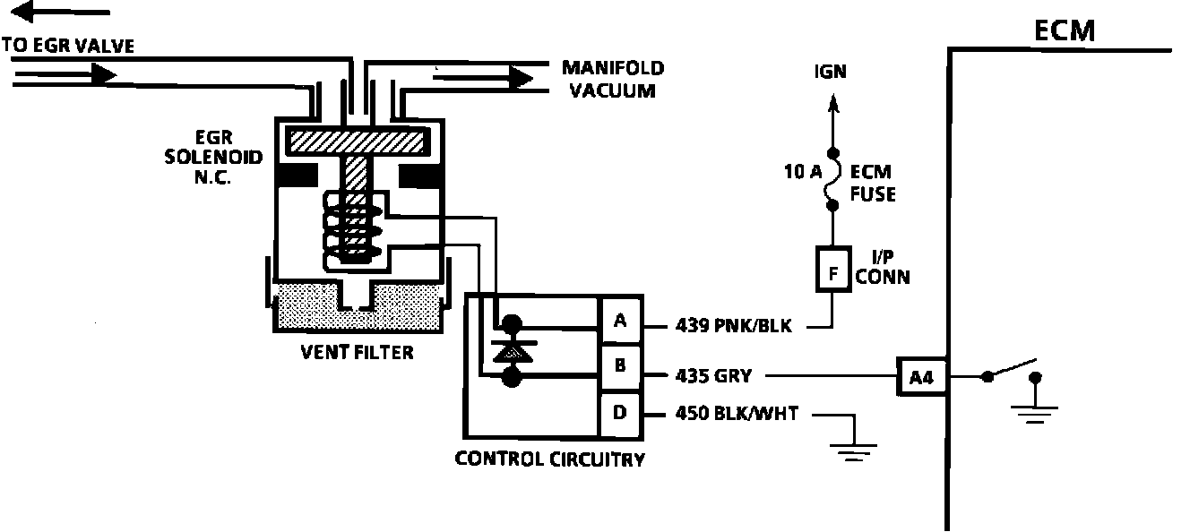 The EGR valve is controlled by a normally open regulator with a normally open air bleed. The ECM signals the regulator to control the amount of air bleed. As more air is allowed to bleed, less vacuum can be applied to the EGR valve, resulting in less EGR. The ECM diagnoses the system using an internal EGR test procedure.