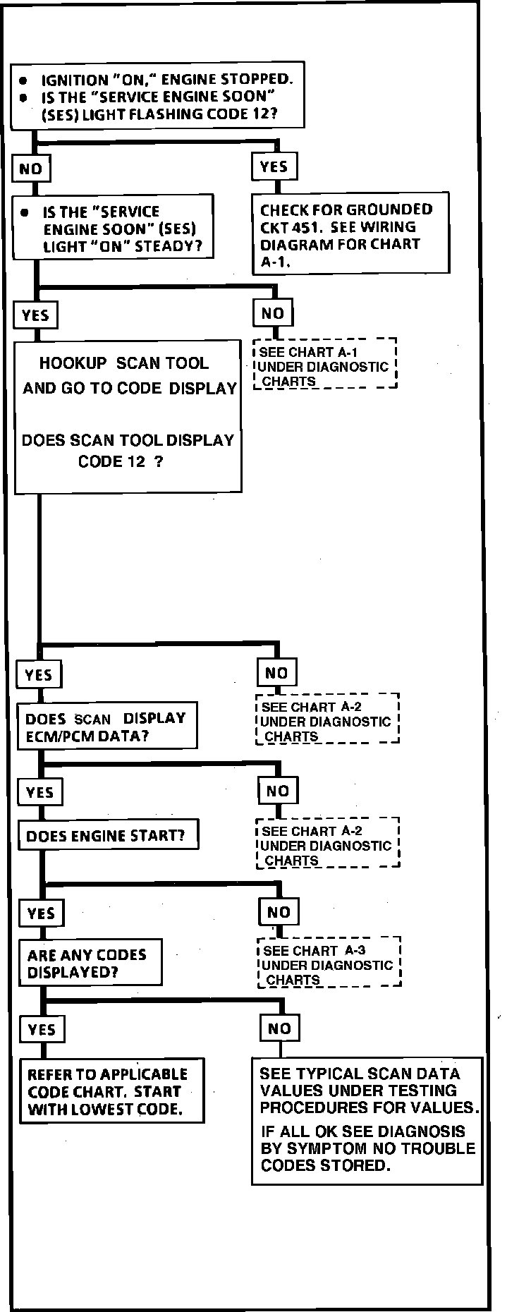 1. Bulb Check - to check SES light circuit and that the computer can complete the circuit. The system check starts with a bulb check. If there is no "SERVICE ENGINE SOON" light, refer to CHART A-1.