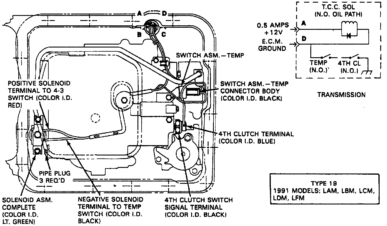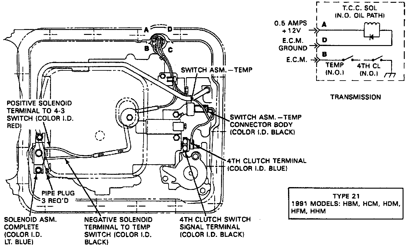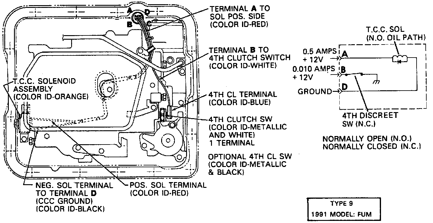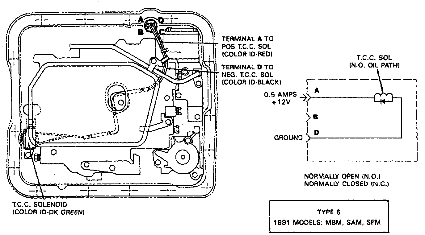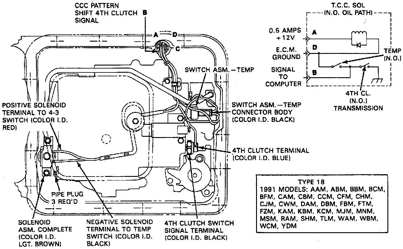16. Select the proper transmission model code from the images - the model code designation is found within a box in the image. Correctly route and connect solenoid assembly wiring. The wire connectors are color coded to correspond to the information in the wiring diagram. On switches which take two connectors, the terminals are reversible.