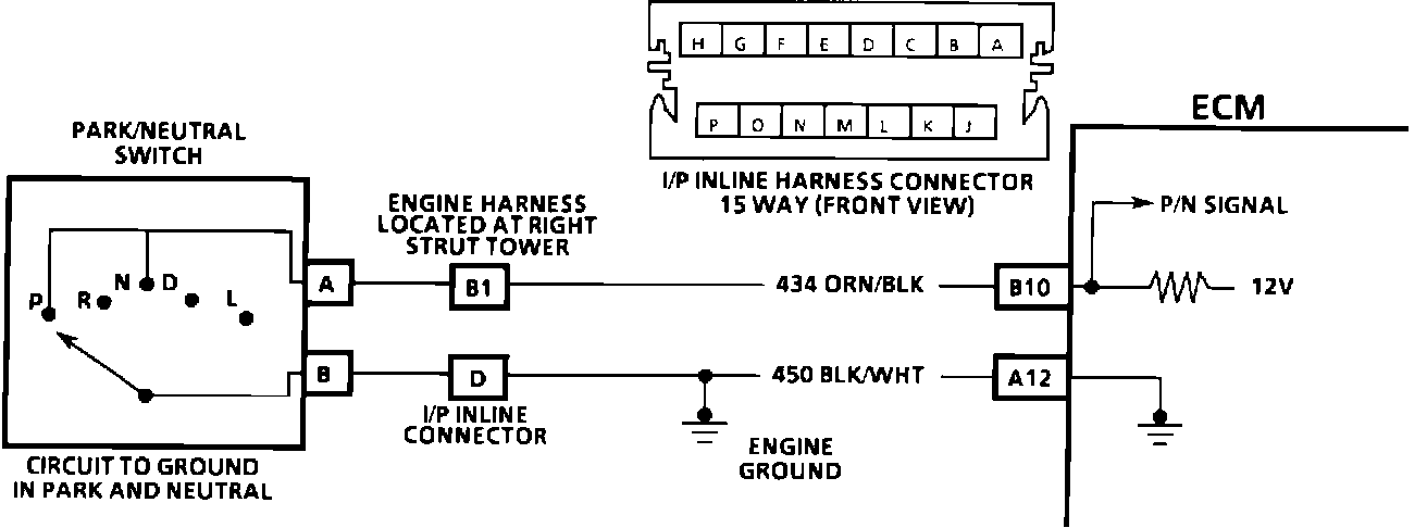 The PNP switch contacts are closed to ground in park or neutral and open in drive ranges and reverse. The ECM supplies ignition voltage through a current limiting resistor to the switch and senses a closed circuit when voltage drops to less than 1 volt.