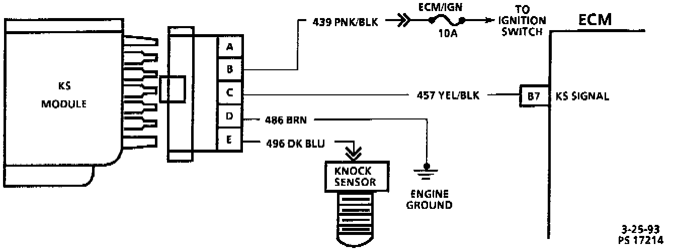5. Contacting CKT 496 with a test light to 12 volts should generate a knock signal to determine whether the knock sensor is faulty, or the KS module can't recognize a knock signal.