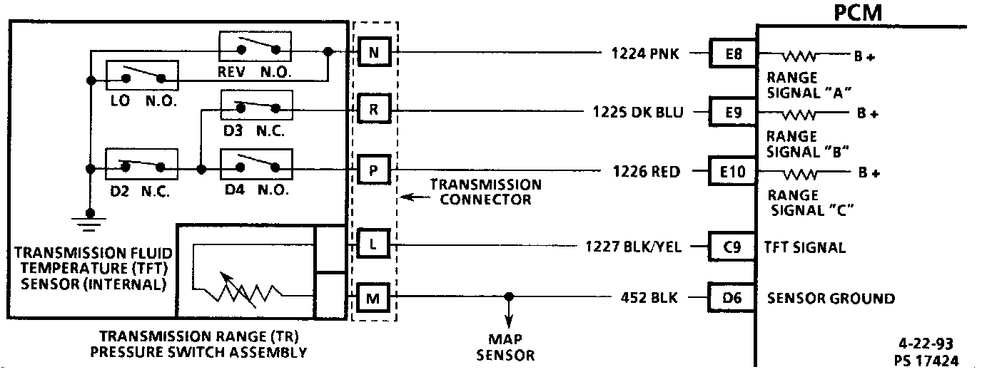 The Transmission Range (TR) switch assembly consists of five pressure switches (two normally closed and three normally open), and a Transmission Fluid Temperature (TFT) sensor combined into one unit and mounted on the valve body. The Powertrain Control Module (PCM) supplies battery voltage to each range signal. By grounding one or more of these circuits through various combinations of the pressure switches, the PCM detects what manual valve position has been selected by the vehicle operator. With ignition 'ON" and engine "OFF" P/N will be indicated. When transmission electrical connector is disconnected, the ground potential for the three range signals to the PCM will be removed, and with ignition "ON," D2 will be indicated.
