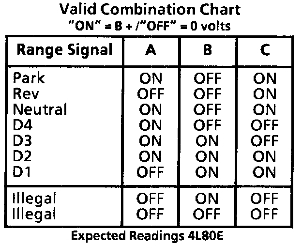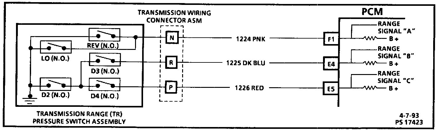The Transmission Range (TR) switch assembly consists of five normally open pressure switches. The PCM supplies battery voltage to each range signal. By grounding one or more of these circuits through various combinations of the pressure switches, the PCM detects what manual valve position has been selected by the vehicle operator. With ignition "ON" and engine "OFF," P/N will be indicated. When the transmission electrical connector is disconnected, the ground potential for the three range signals to the PCM will be removed, and with ignition "ON," D2 will be indicated.