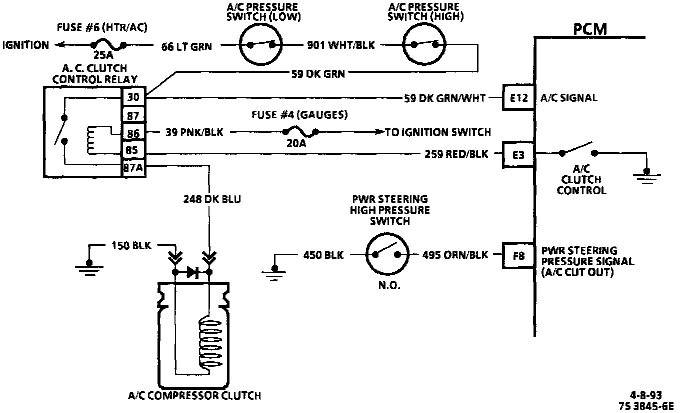 Turning "ON" air conditioning supplies CKT 59 battery voltage to the clutch control relay and terminal "E12". After a time delay of about 1/2 second the PCM will ground terminal "E3", CKT 259, and close the control relay. The A/C compressor clutch will then engage.