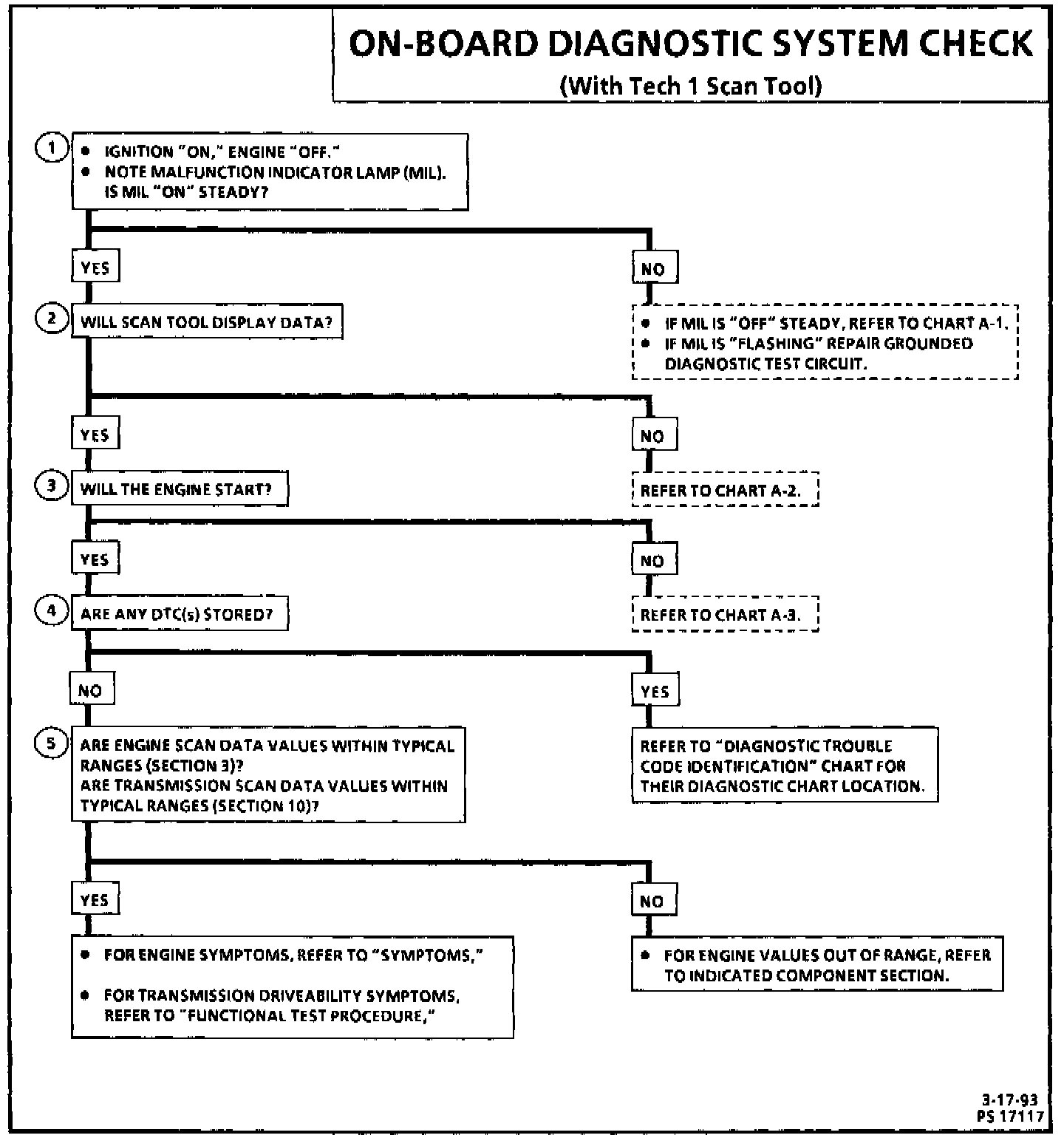 The on-board diagnostic system check is an organized approach to identifying a problem created by a control module system malfunction. It must be the starting point for any driveability complaint diagnosis, because it directs the service technician to the next local step in diagnosing the complaint.. Understanding the chart and using it correctly will reduce diagnostic time and prevent the unnecessary replacement of good parts.