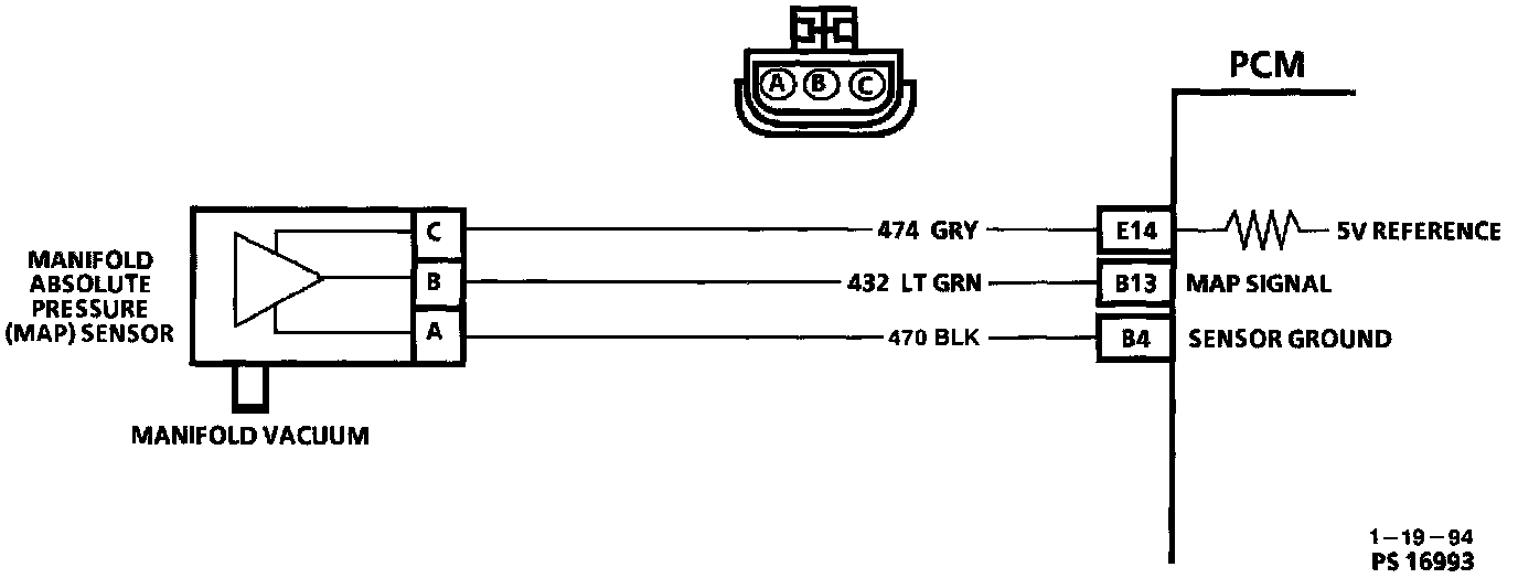 2. Jumpering harness terminals "B" to "C" (5 volts to signal circuit) will determine if the sensor is at fault, or if there is a problem with the PCM or wiring.
