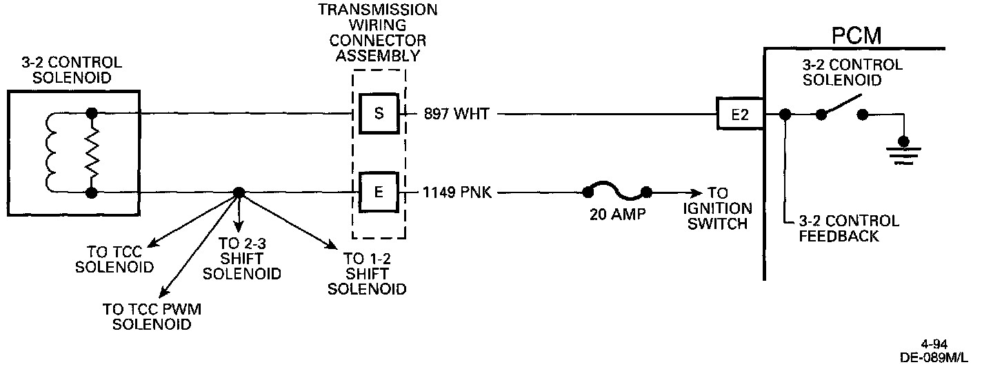 The Powertrain Control Module (PCM) continually monitors the 3-2 circuit duty cycle depending on the commanded state of the circuit. When the transmission is in first gear the duty cycle of the solenoid is equal to zero. When the transmission is in second gear or higher the duty cycle of the solenoid will be about 90%. When the transmission downshifts, 3-2, the duty cycle of the solenoid will drop.