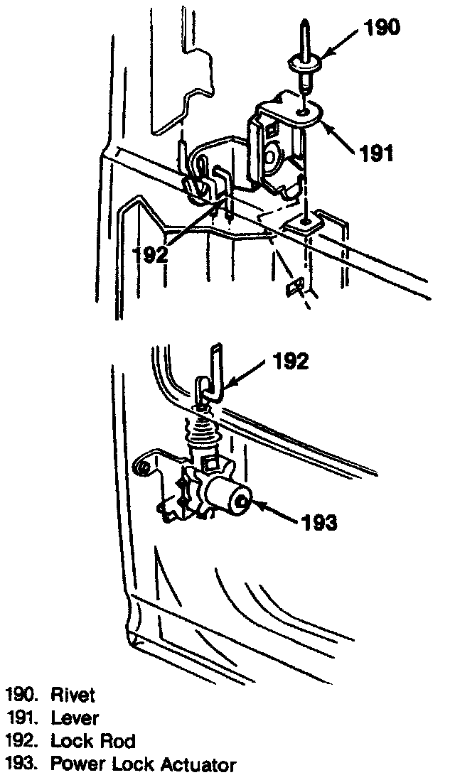 2. Lever to door fasteners. Use a 6 mm (1/4 inch) diameter bolt 13 mm (1/2 inch) long with a spring washer, and nut, to re-attach the lever to the door.