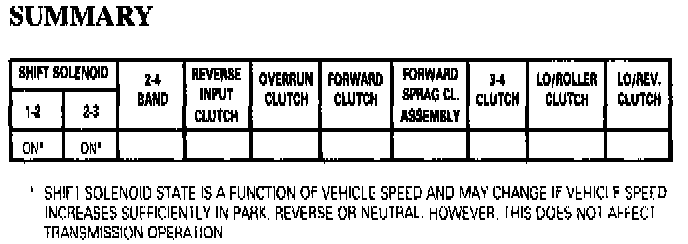 Note: In Park, Reverse, and Neutral the shift solenoids are shown energized. This is the normal operating state when the vehicle is stationary or at low vehicle speeds. However, the PCM will change the shift solenoid states depending on vehicle speed. For example, if Neutral is selected when the transmission is operating in Second Gear, the shift solenoids will remain in a Second Gear state. However; with the manual valve blocking line pressure, the shift solenoid states do not affect transmission operation in Park, Reverse and Neutral.