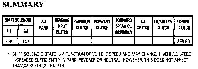 Lo Overrun Valve: PR fluid pressure moves the valve against spring force and fills the lo/reverse fluid circuit. Lo/reverse fluid is orificed (#23) back to the lo/overrun valve to assist PR fluid in moving the valve against spring force. Spring force provides a time delay for PR fluid filling the lo/reverse fluid circuit. Lo/reverse fluid is routed to the inner area of the lo and reverse clutch piston to increase the holding capacity of the clutch.