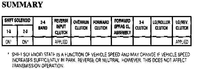 Lo and Reverse Clutch: As in Park, PR fluid pressure acts on the outer area of the lo and reverse clutch piston to apply the lo and reverse clutch. Also, lo/reverse fluid from the lo overrun valve acts on the inner area of the piston to increase the holding capacity of the clutch (see Note Below).