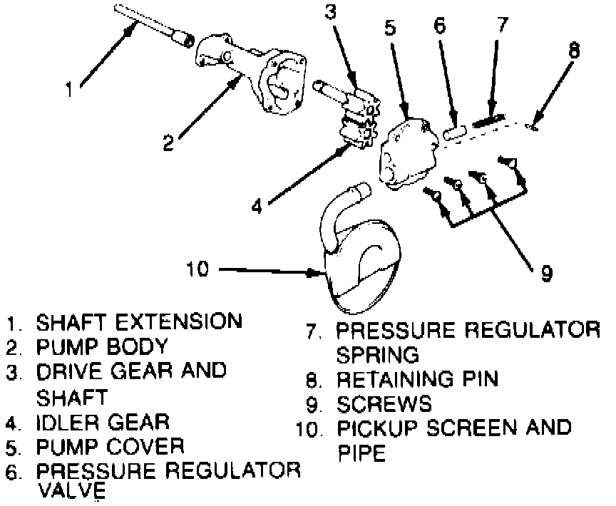 2. Inspect pump gears for damage or excessive wear. If pump body or gears are damaged or worn, the entire oil pump assembly must be replaced.