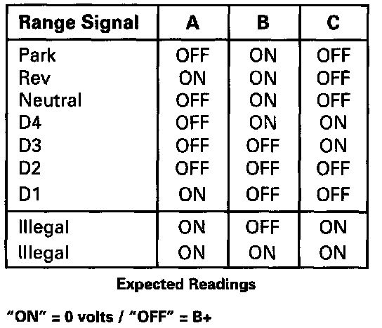 Refer to Figure #3 for various A/B/C range combinations. Check all wiring connectors for proper terminal tension. For current DTC 28, range signal will default to "D4" while A/B/C range values continue to read actual "TR Pressure Switch Output" for each range selection. Perform a resistance check on the transmission range switch if necessary.
