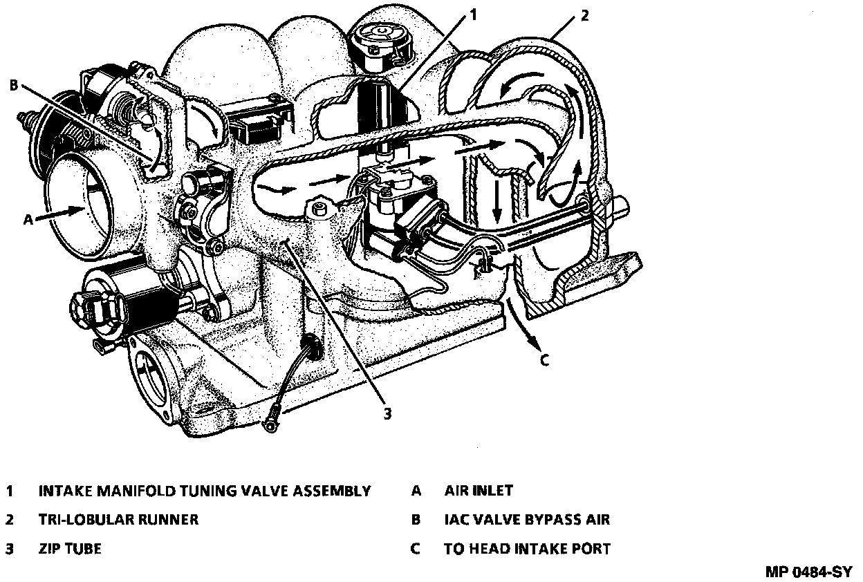 The intake manifold is made up of the upper and lower manifold assemblies. The upper manifold assembly is a variable tuned split plenum design that includes an intake manifold tuning valve. Figure 1 depicts the relative location on the intake manifold/plenum.