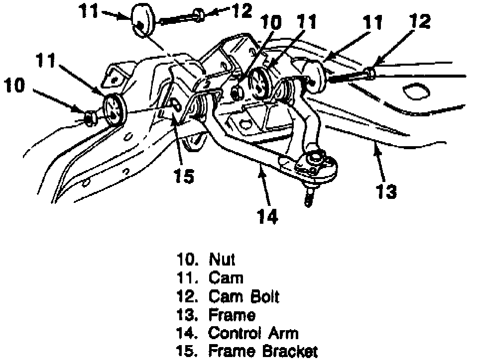 Caster and camber adjustments are made by rotating the offset cam bolt and cam in slotted frame bracket to reposition control arm Fig. 2. To adjust caster and camber, loosen upper control arm-to-frame attaching bolts. Rotate cam by rotating cam bolt head.