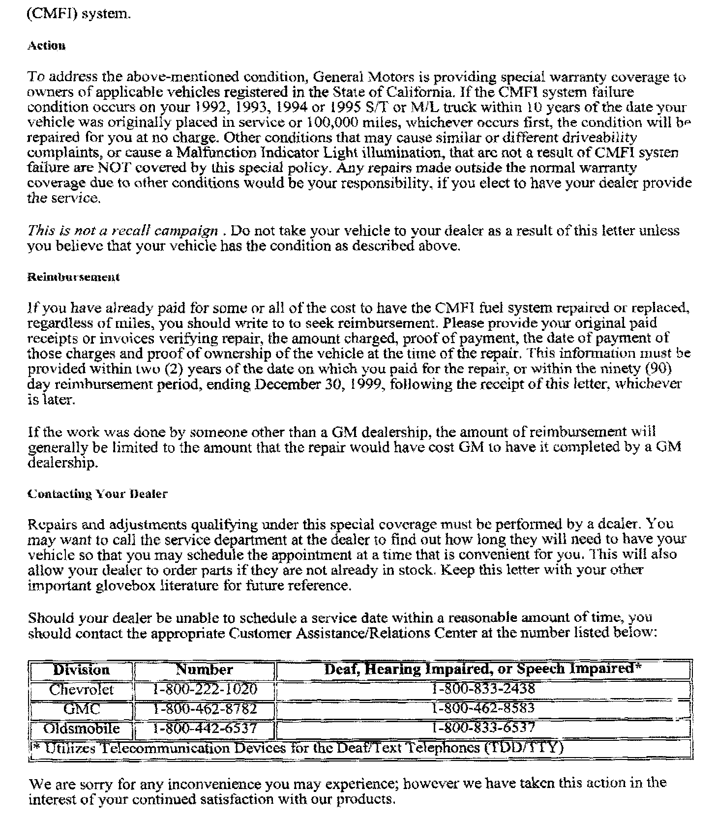 by General Motors (see copy of typical customer letter included