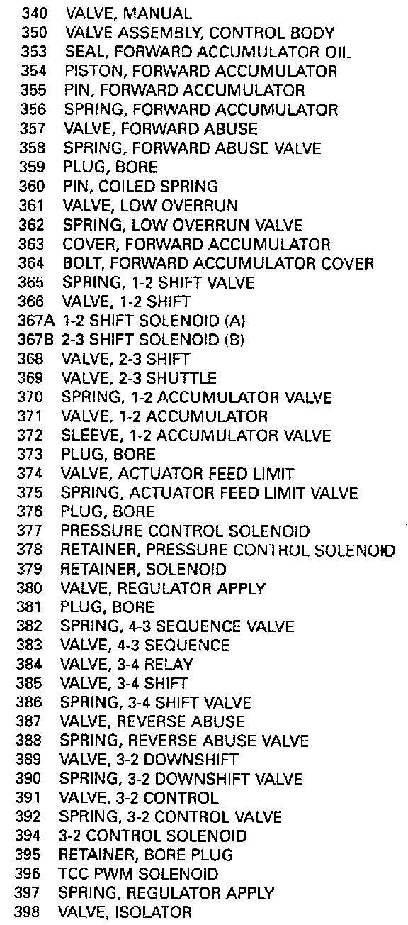 4. 1-2 shift solenoid retainer (379), solenoid (367) and valve train (365 and 366).