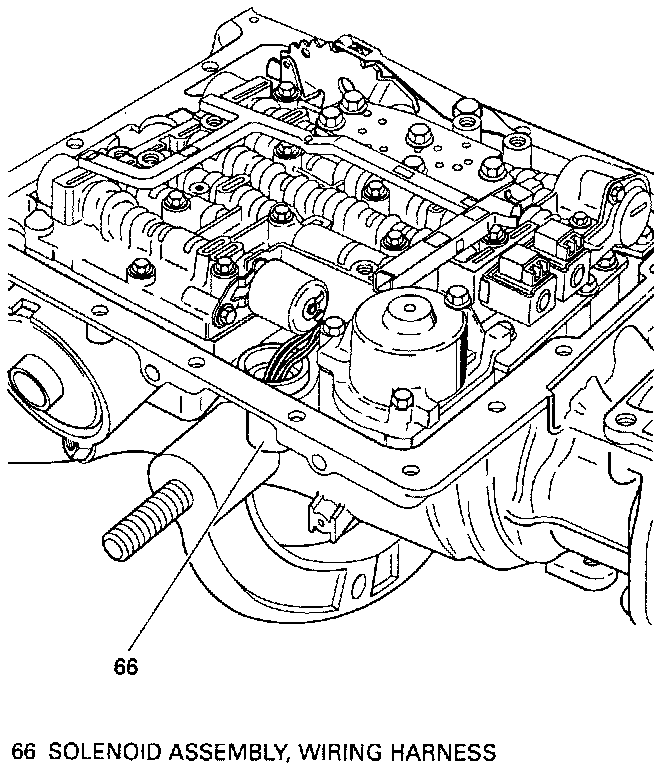 3. Wiring harness (66), manual spring assembly (63), pressure switch assembly(69), dipstick, stop bracket (93) and all remaining valve body bolts.