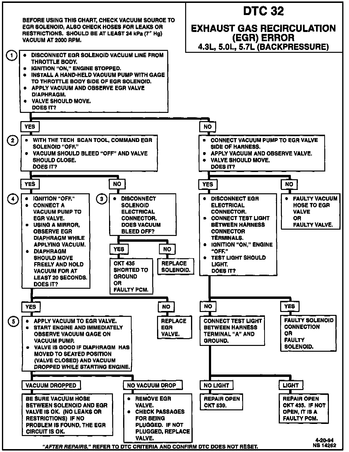 The PCM monitors EGR effectiveness by de-energizing the EGR control solenoid, thereby, shutting "OFF" vacuum to the EGR valve diaphragm. With the EGR valve closed, and O2S fluctuating normally, fuel integrator counts will be greater than they were during normal EGR operation. If the change is not within the calibrated window, after failing the test twice a DTC 32 will be set.