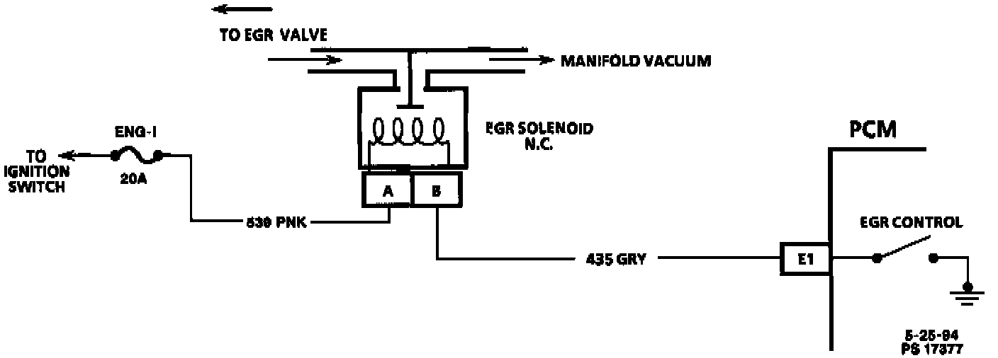 The PCM operates a solenoid to control the Exhaust Gas Recirculation (EGR) valve. This solenoid is normally closed. By providing a ground path, the PCM energizes the solenoid which then allows vacuum to pass to the EGR valve.