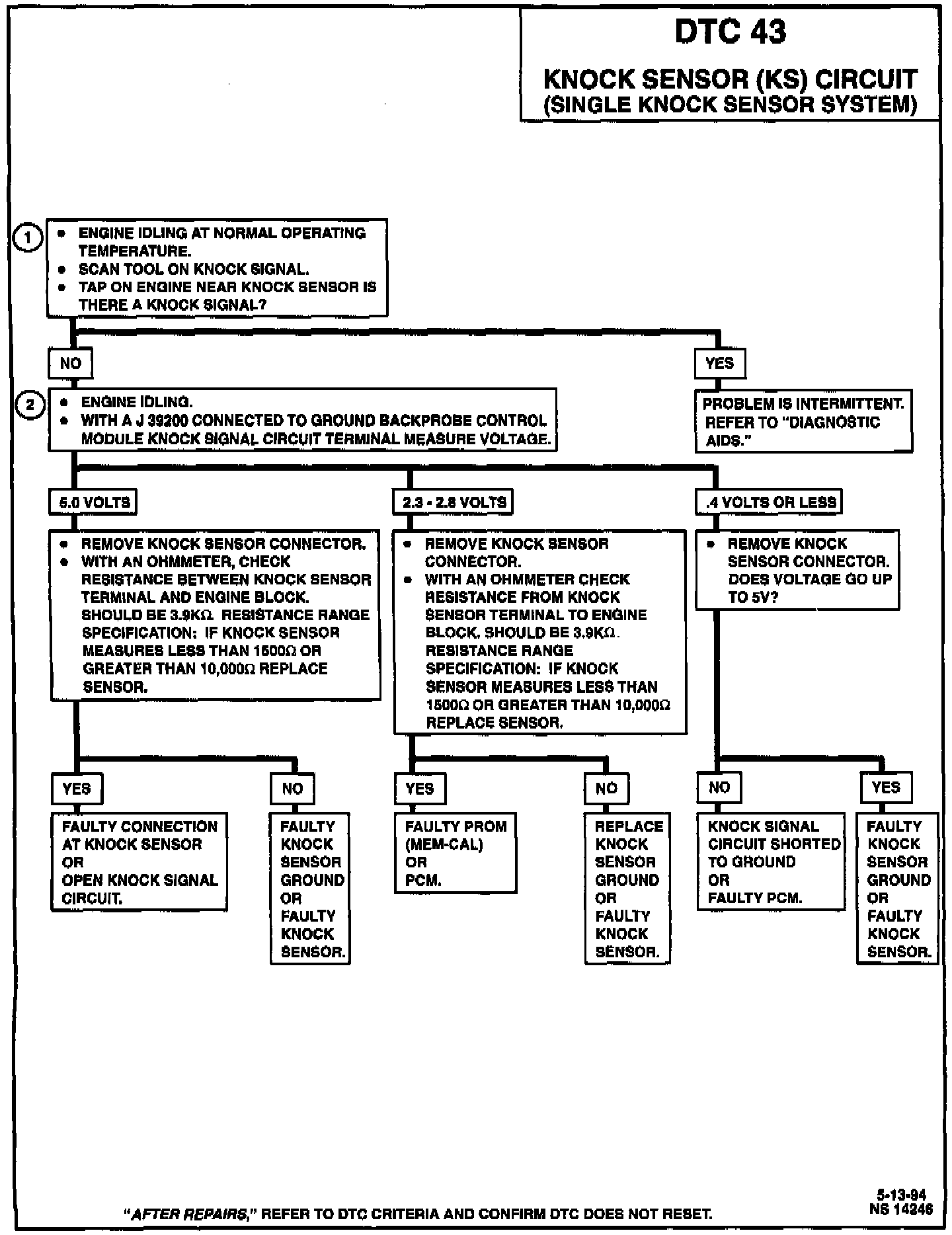 The DTC 43 circuit consists of a knock sensor with one wire that goes directly to the PCM. There are two DTC 43 checks performed by the PCM. One check consists of monitoring the knock signal circuit for a voltage that is more than 4.3 volts and less than 0.64 volt.