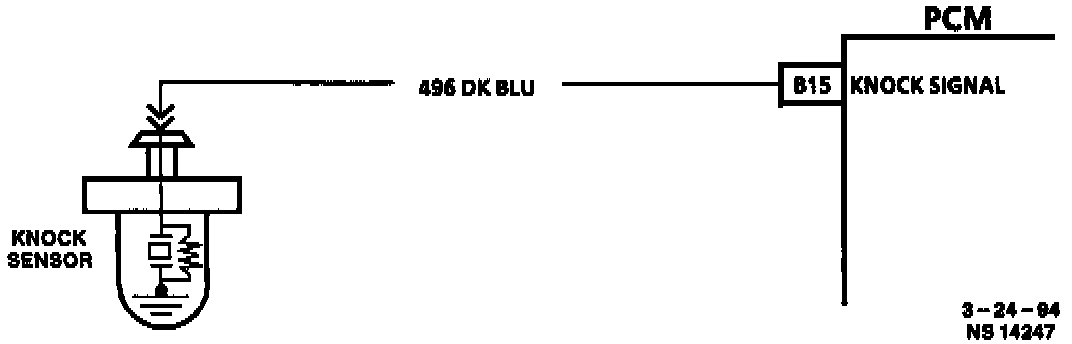 The PCM applies 5 volts to knock signal circuit. A 3.9k ohm resistor in the knock sensor reduces the voltage to about 2.5 volts. When knock occurs, the knock sensor produces a small AC voltage that rides on top of the 2.5 volts already applied. An AC voltage monitor in the PCM is able to read this signal as knock and incrementally retard spark.