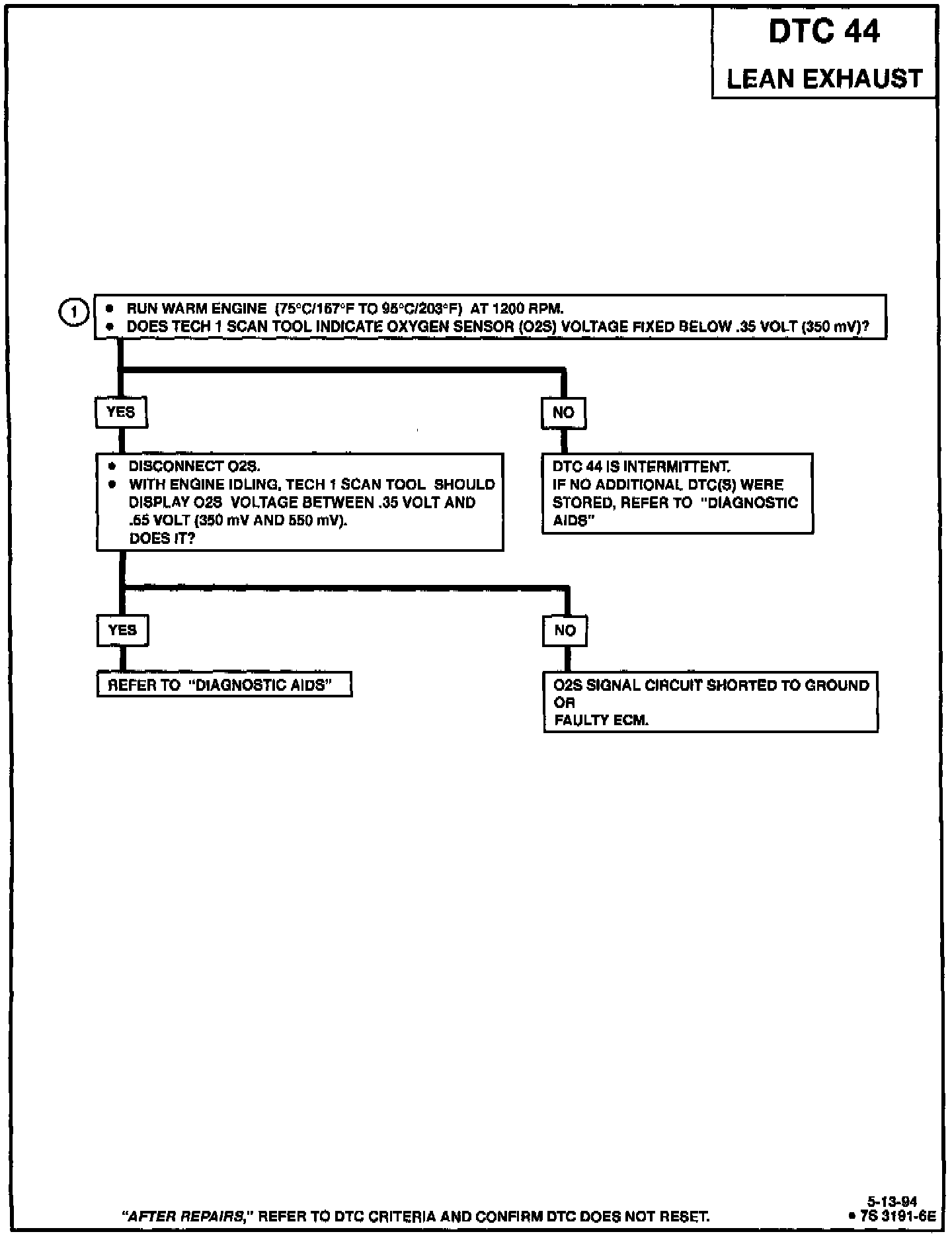 Using a scan tool, observe the long term fuel trim values at different rpm and air flow conditions. The scan tool also displays the block cells, so the long term fuel trim values can be checked in each of the cells to determine when the DTC 44 may have been set. If the conditions for DTC 44 exists, the long term fuel trim values will be around 150.