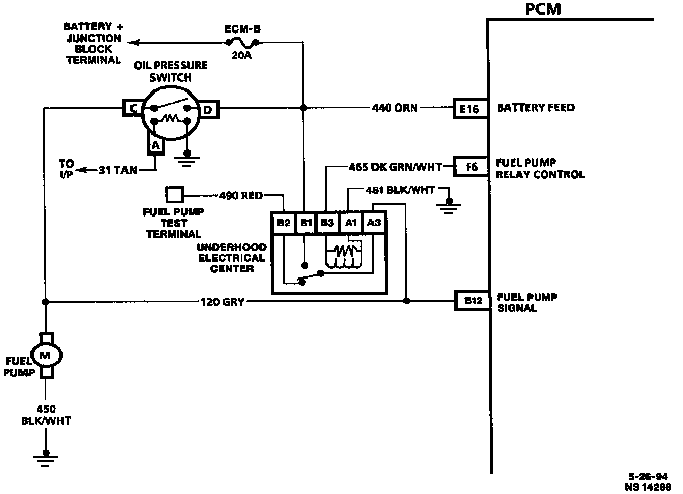 The status of the fuel pump CKT 120 is monitored by the PCM at terminal "B12" and is used to compensate fuel delivery based on system voltage. This signal is also used to store a DTC if the fuel pump relay is defective or fuel pump voltage is lost while the engine is running. There should be about 12 volts on CKT 120 for at least 2 seconds after the ignition is turned "ON," or any time reference pulses are being received by the PCM.