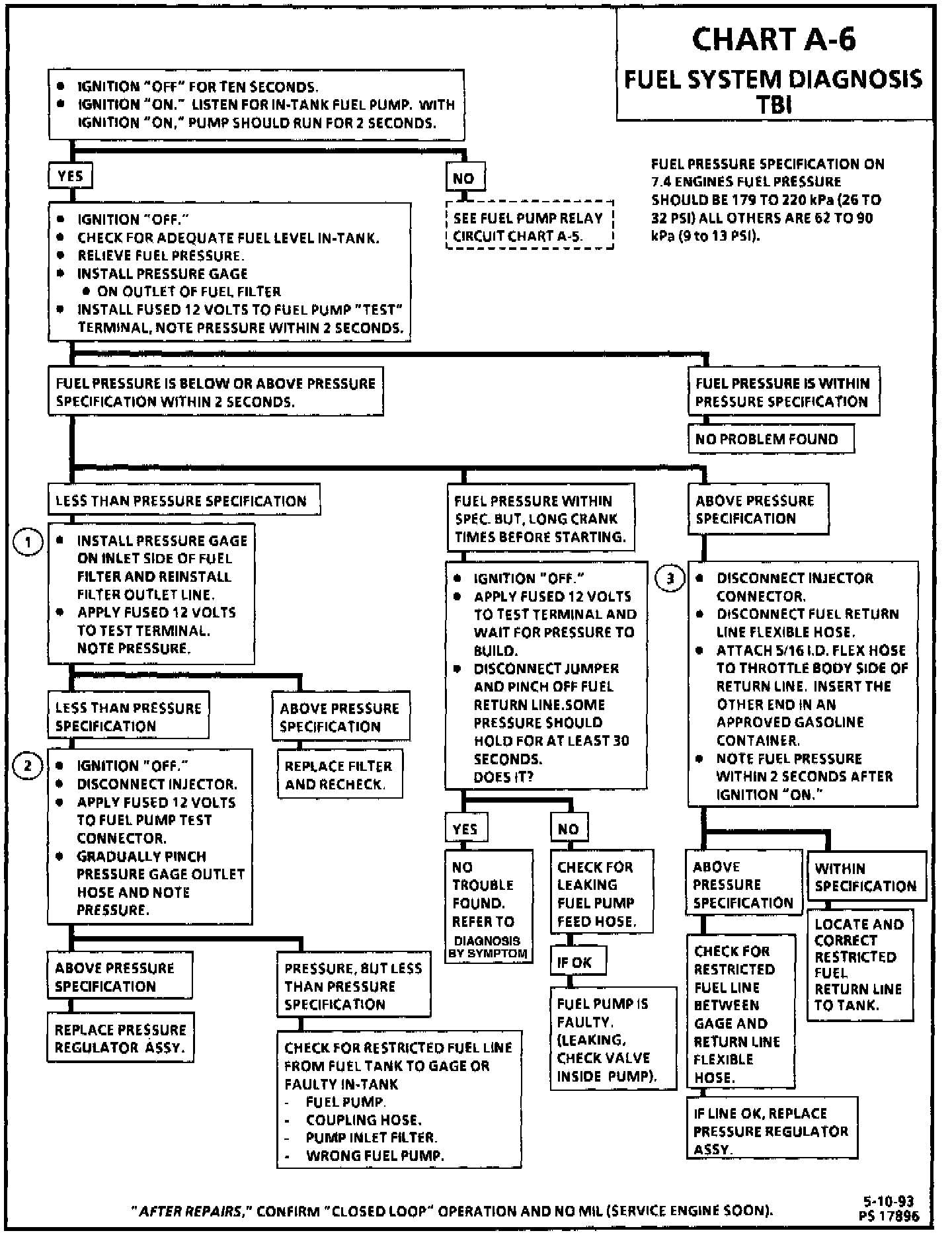 ^ Regulated pressure but less than minimum specifications - Amount of fuel to injector OK but pressure is too low. System will run lean and may set DTC 44. Also, hard starting cold and poor overall performance.