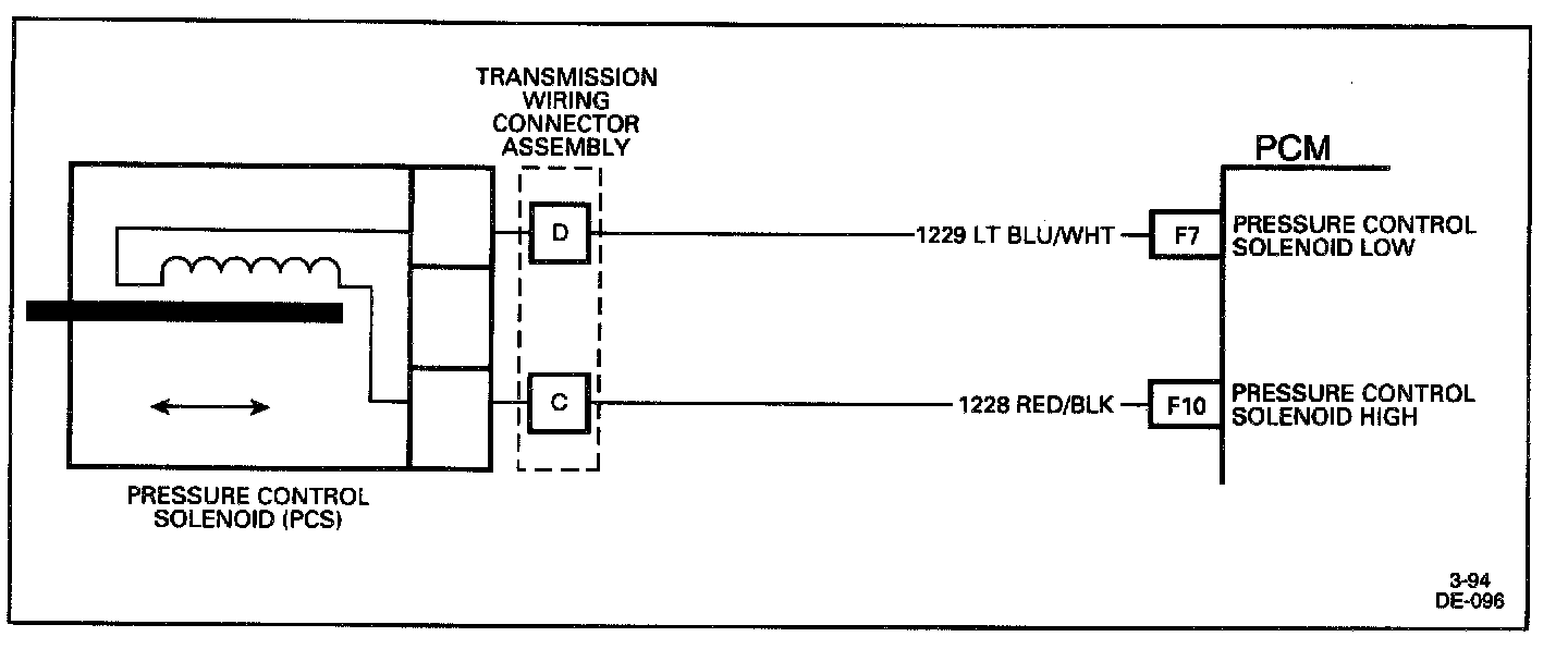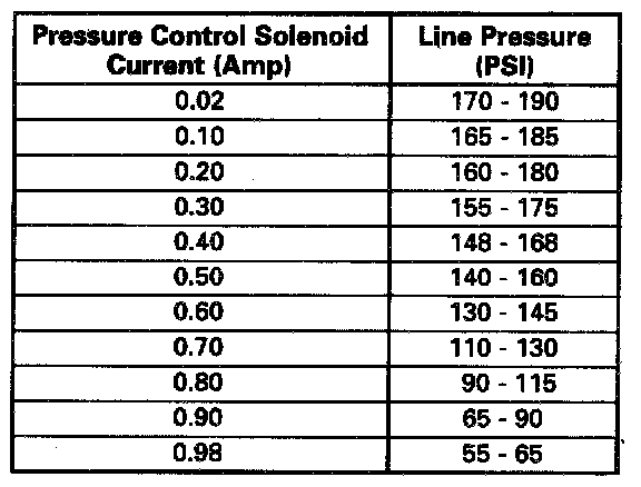 The pressure control solenoid is a PCM controlled device used to regulate transmission line pressure. The PCM compares TP voltage, engine RPM and other inputs to determine the line pressure appropriate for a given load. The PCM will regulate the pressure by applying a varying amperage to the pressure control solenoid. The applied amperage can vary from 0.1 to 1.1 amp. The PCM then monitors the amperage at the return line.