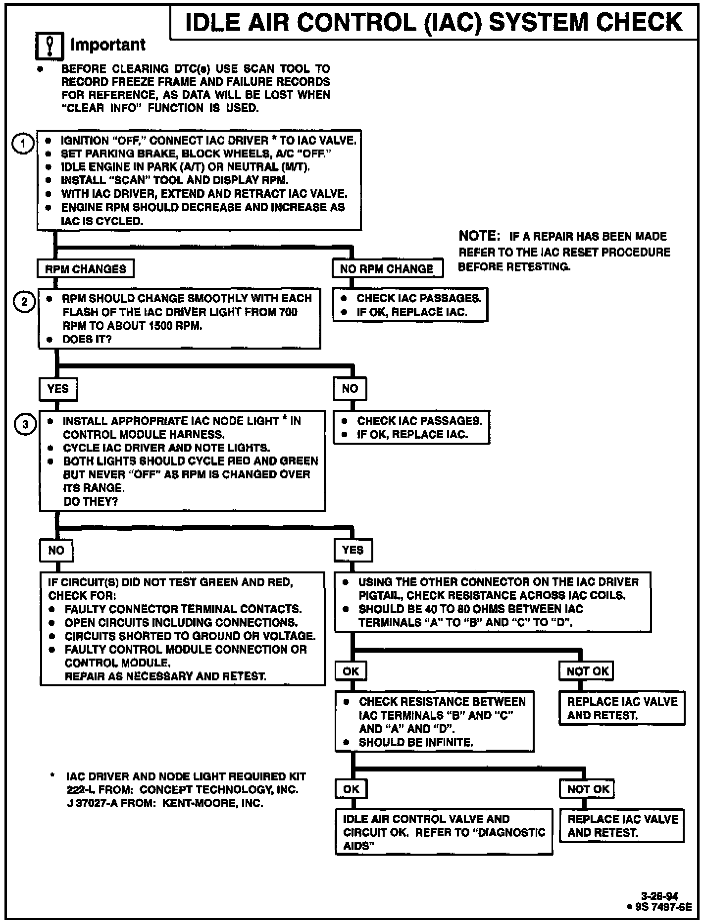 ^ If intermittent poor driveablity or idle symptoms are resolved by disconnecting the IAC, carefully recheck connections, valve terminal resistance or replace IAC.