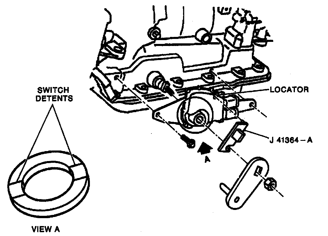 1. Install Tool J-41384A to Park Neutral Back Up Switch. Be sure that the two detentes on the switch (where manual shaft is inserted) are lined up with the lower two tabs on tool. Rotate tool until upper locator pin on tool is lined up with locator on switch.