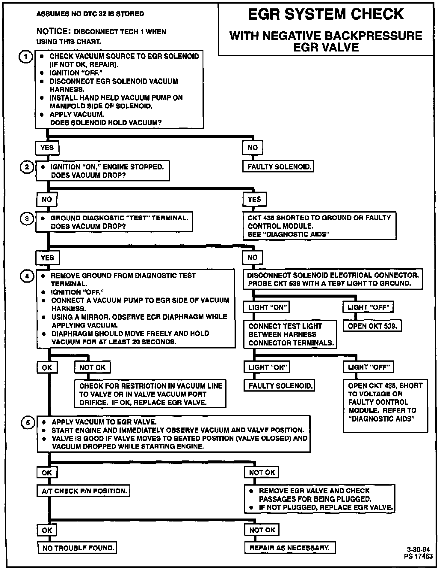 DTC 32 will detect a faulty solenoid, vacuum supply, EGR valve or plugged passage. This chart checks for plugged EGR passages, a sticking EGR valve, or a stuck open or inoperative solenoid.