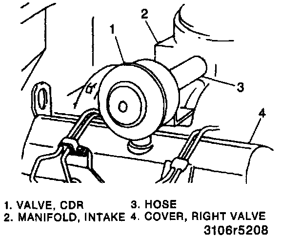 The crankcase depression regulator (CDR) valve is used to regulate the flow of crankcase gases back into the engine. The valve is designed to limit vacuum in the crankcase as the gases are drawn from the right valve cover, through the valve, and into the intake manifold.
