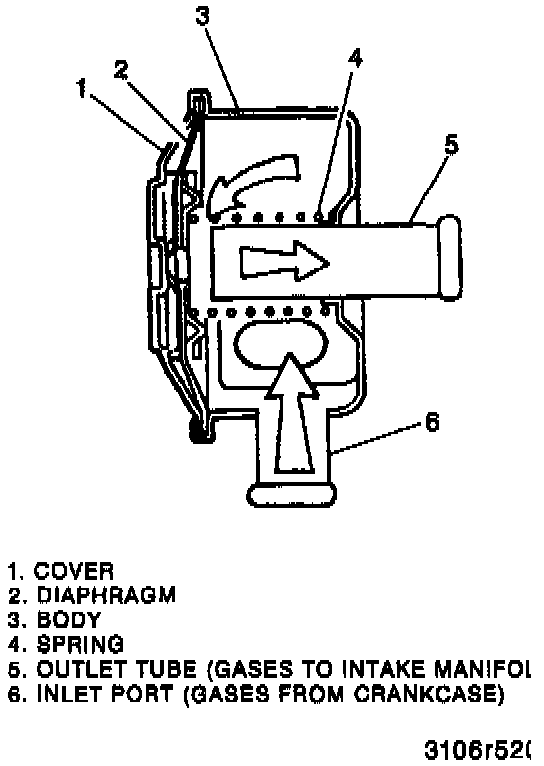 The intake manifold vacuum acts against a spring loaded diaphragm to control the flow of crankcase gases. Higher intake vacuum levels pull the diaphragm closer to the top of the outlet tube. This reduces the amount of gases being drawn from the crankcase and decreases the vacuum level in the crankcase. As the intake vacuum decreases, the spring pushes the diaphragm away from the top of the outlet tube allowing more gases to flow to the intake manifold. For information about the Diagnostic Trouble Codes (DTC), refer to Computers and Control Systems / System Diagnosis. Testing and Inspection